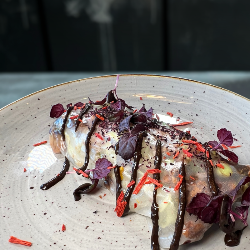 Reisblatt kurz in warmes Wasser einweichen, auf ein mit Wasser benetztes Teller legen, fertig angerichtetes Salatschifferl draufgeben und einwickeln.